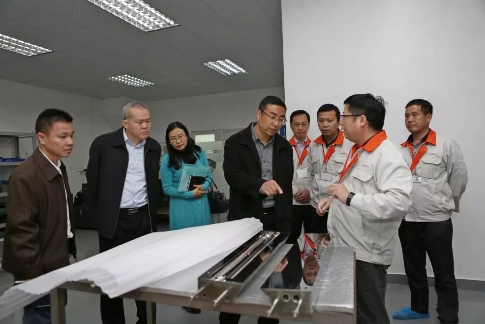 总经理杨志明先生陪同街道办各位领导参观介绍公司的精密加工车间和研发中试车间,重点介绍了我司自制模头的核心技术及锂电池前段生产中试线,初庆书记对我司的努力及取得的成绩表示肯定与赞扬。