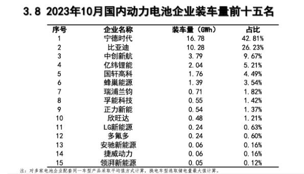具体来看,今年10月,国内动力电池装车量排行前三分别被宁德时代、比亚迪、中创新航牢牢占据,装车量分别为16.78GWh、10.28GWh、3.79GWh,市占率分别为42.81%、26.23%、9.67%。