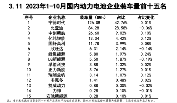 1-10月,国内动力电池装车量排行前三依然是宁德时代、比亚迪、中创新航,装车量分别为126.08GWh、84.28GWh、26.6GWh,市占率分别为42.76%、28.58%、9.02%。