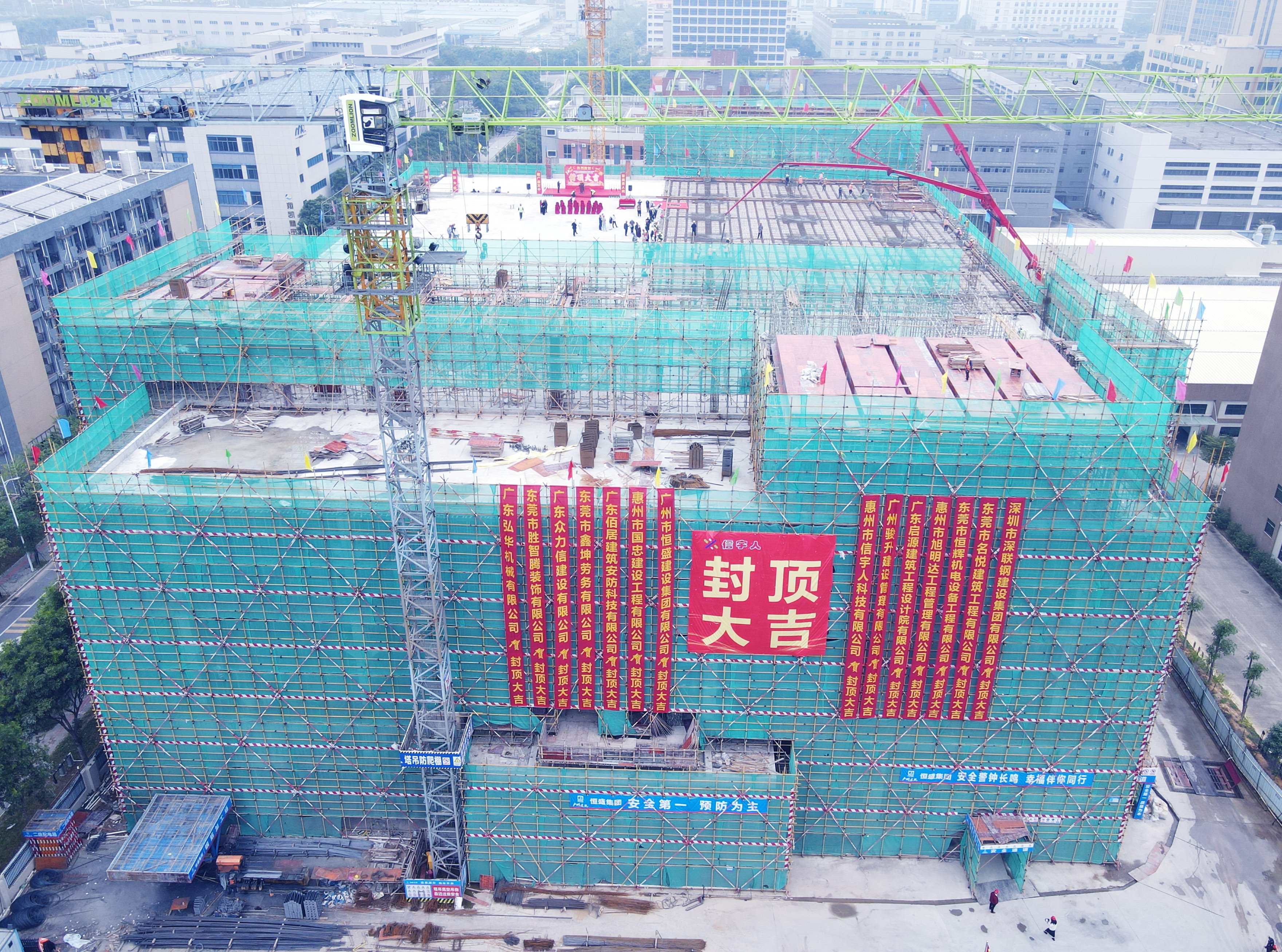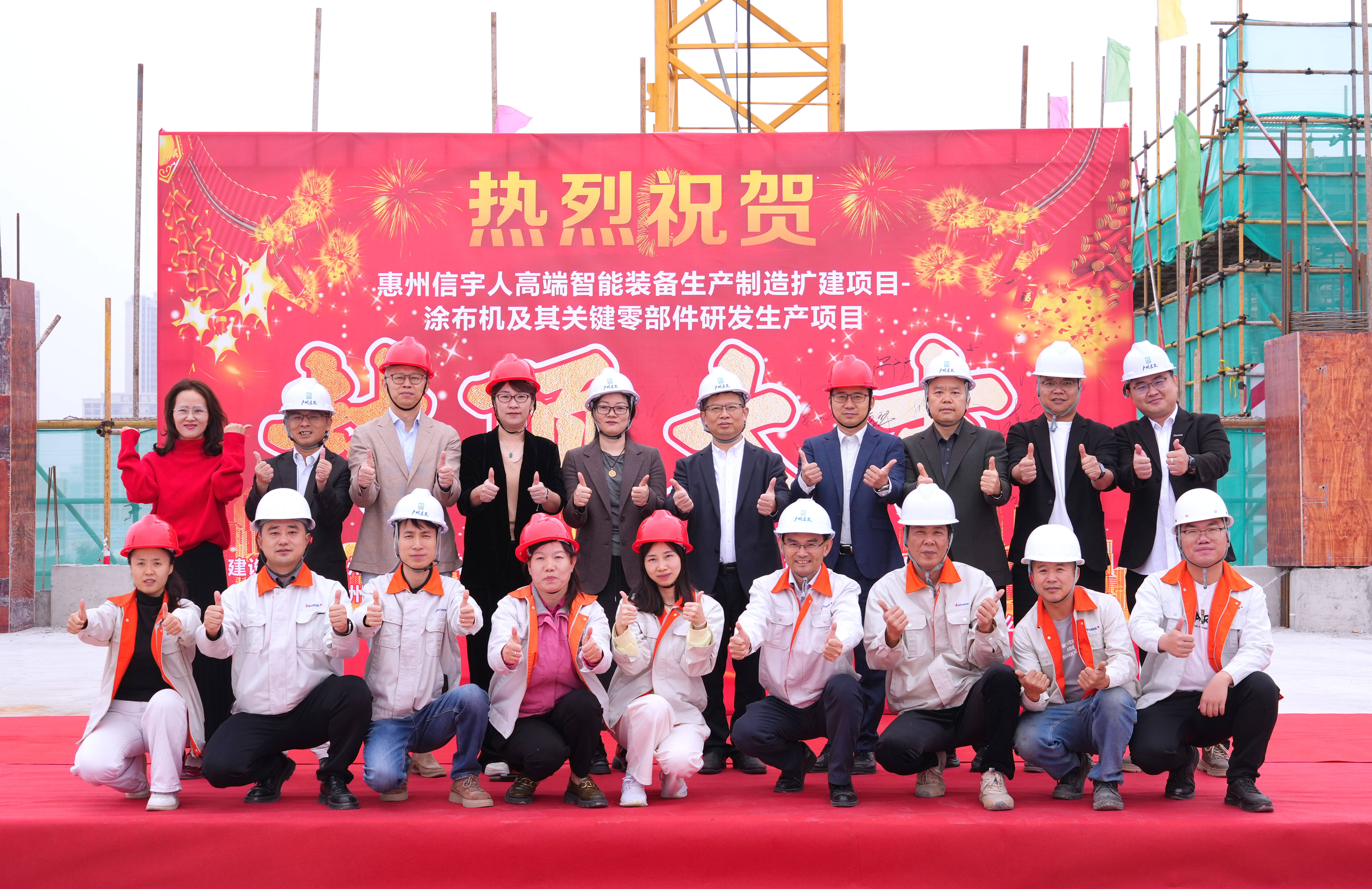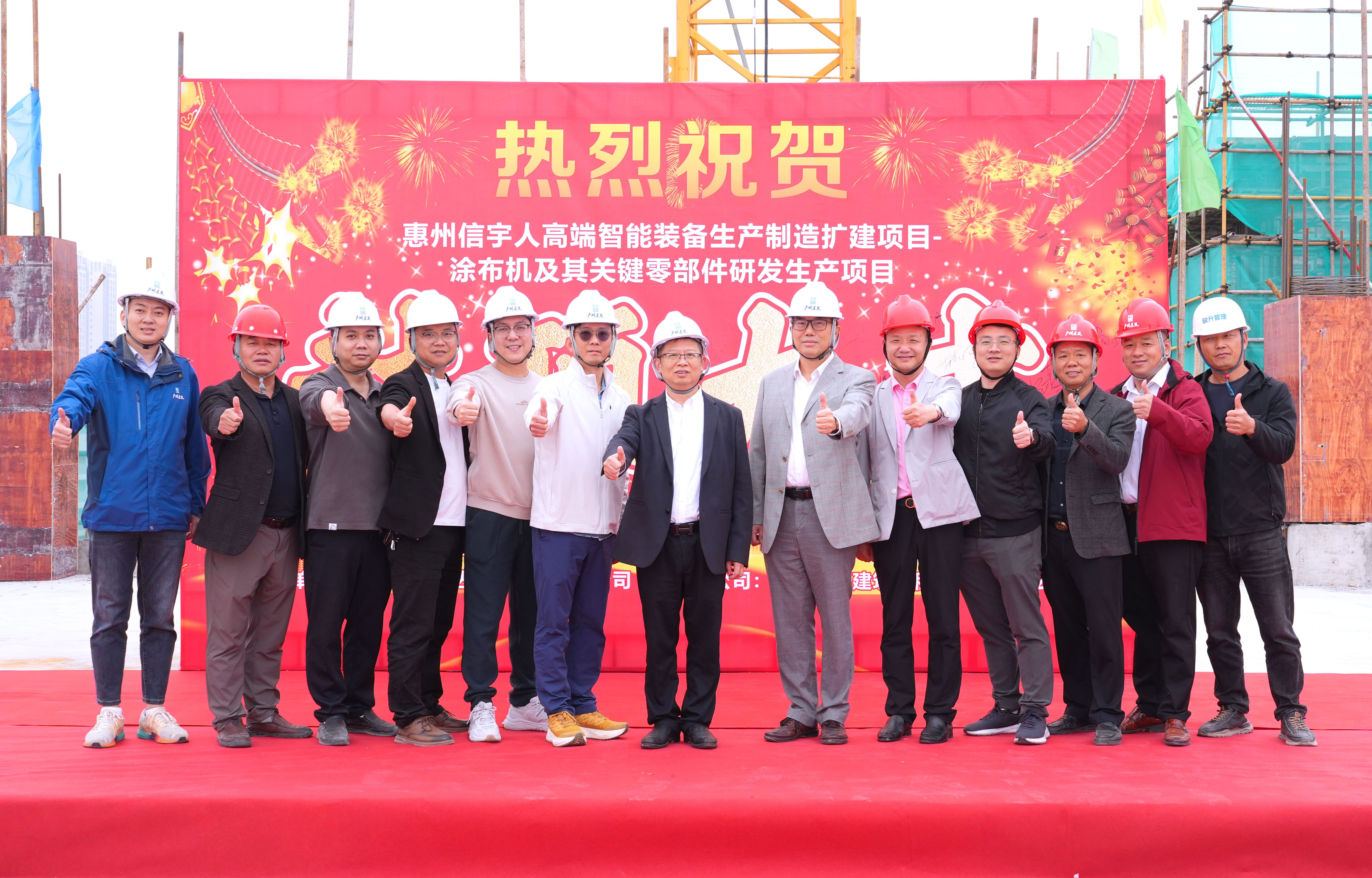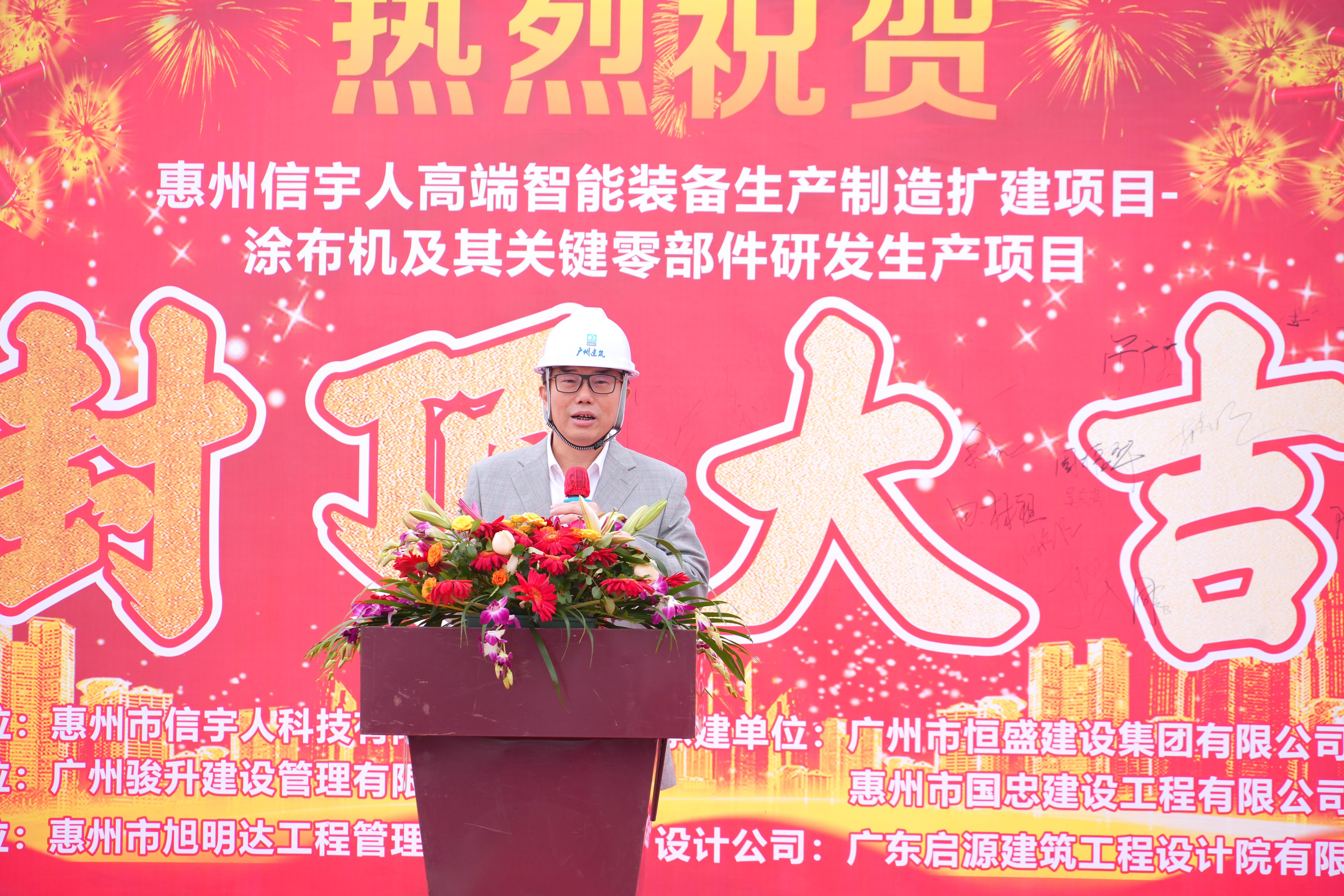 伴随着喜庆的现场氛围,在政府单位代表—惠州市仲恺高新区东江科技园管委会总工会主席、项目建设招商专班负责人胡由在,英国威廉希尔董事长杨志明及公司高管、相关管理人员,承建单位—广州恒盛集团总经理曾广庆、副总经理欧建辉等一众人员的共同见证下,英国威廉希尔惠州第二生产园区(惠州英国威廉希尔高端智能装备生产制造扩建项目—涂布机及其关键零部件研发生产项目)喜封金顶!