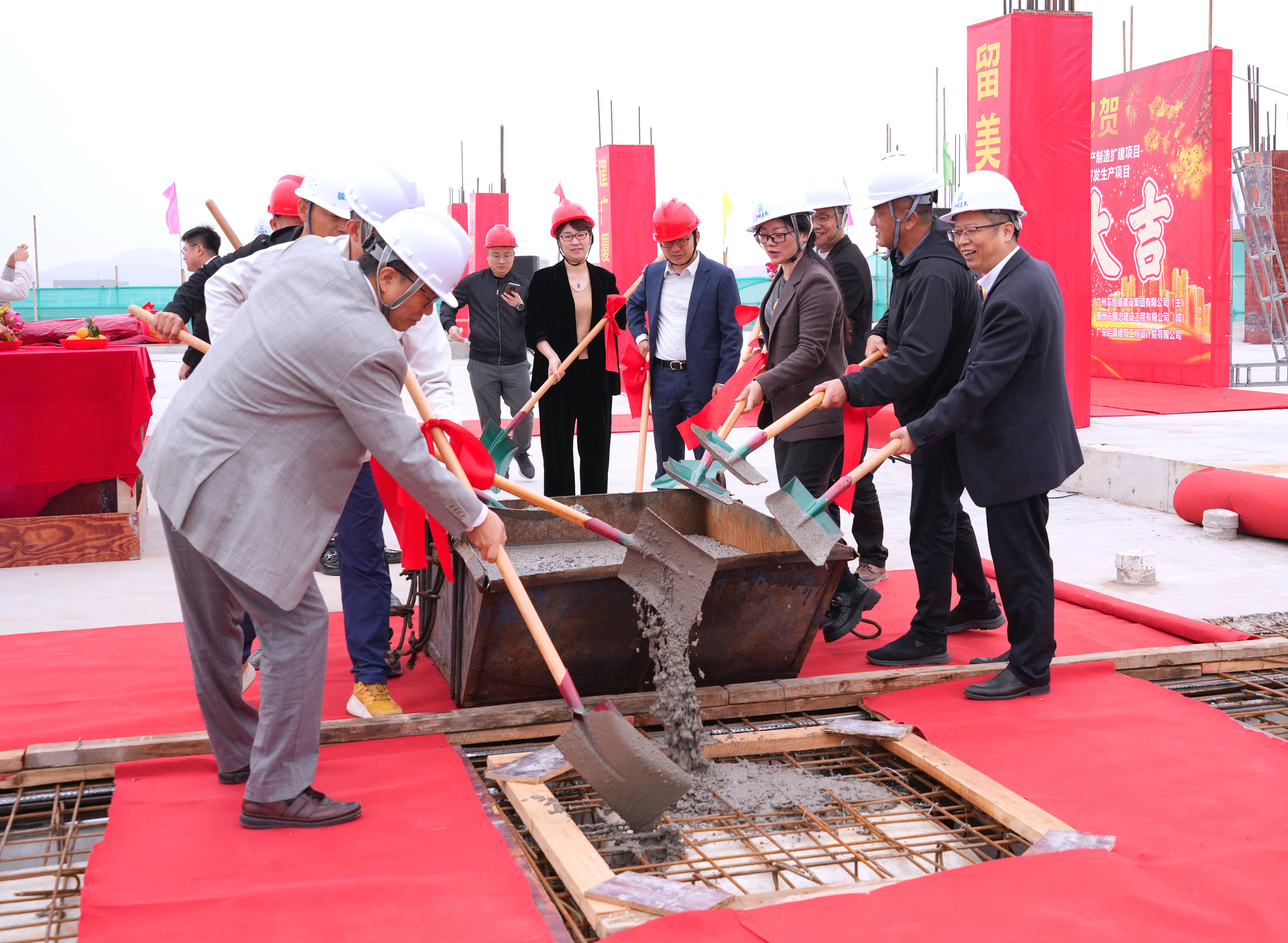 随着各位领导和嘉宾手持铁锹,共同挥锹浇筑混凝土,与此同时,礼炮齐鸣,标志着英国威廉希尔惠州第二生产园区顺利封顶,为后续工程推进奠定了坚实基础。